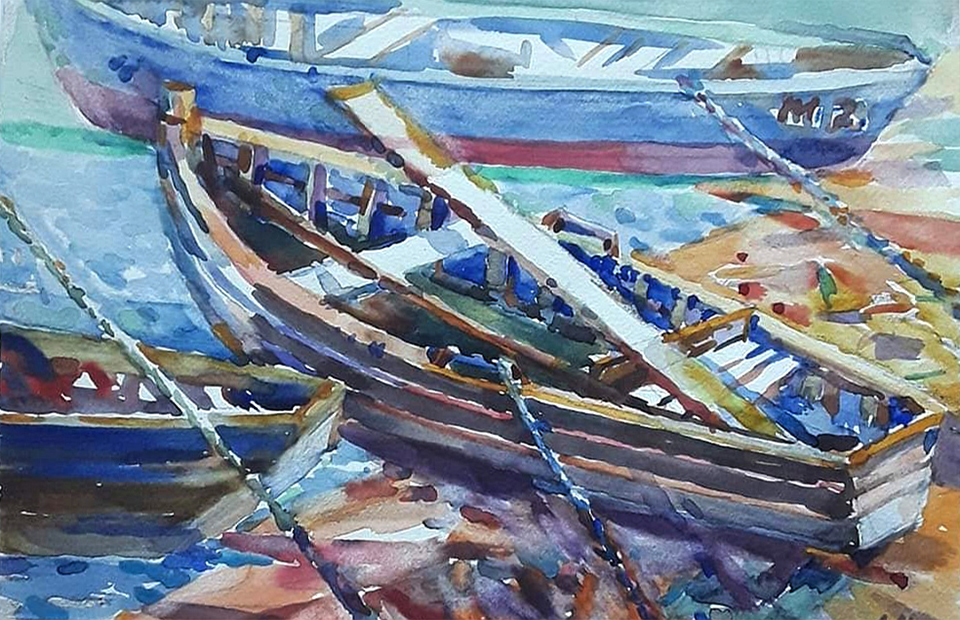 Su daugiasluoksne akvarele dirbanti Viktorija Visockytė savo kūriniuose tarsi užkonservuoja saulės spindulių ir jūros gaivos energiją – atrodo, nedidelio formato akvarelėse netrūksta nei erdvės, nei šviesos. Kompozicijos, kuriose saugiai prisišvartavusios valtys, jachtos ir kurėnai maudosi saulės šviesos sraute galime pajausti judesio, kelionės ilgesį ir, nors žmonių figūrų nematyti, galime užčiuopti amžiną uostamiesčio, kaip tranzitinio miesto, gausmą ir šurmulį. Tikrą keliaujančio akvarelisto dvasią įkūnijančio Kazio Kęstučio Šiaulyčio akvarelėse – ne tik susidūrimas su Klaipėdos gamta ir architektūra, bet ir susitikimai su miesto žmonėmis, vietiniais, kurie to net nesuvokdami prisitaiko prie savo aplinkos, susitapatina su savojo miesto koloritu, ritmu ir detalėmis. Dailininko gebėjimas keliais štrichais išgauti neabejotiną konkretaus žmogaus atpažįstamumą bei charakterio bruožų faksimilinę kopiją atspindi pačios akvarelės šaknis – greitai ir kuo tiksliau pagauti trumpalaikius momentus, iš kurių ir susideda amžinybė.