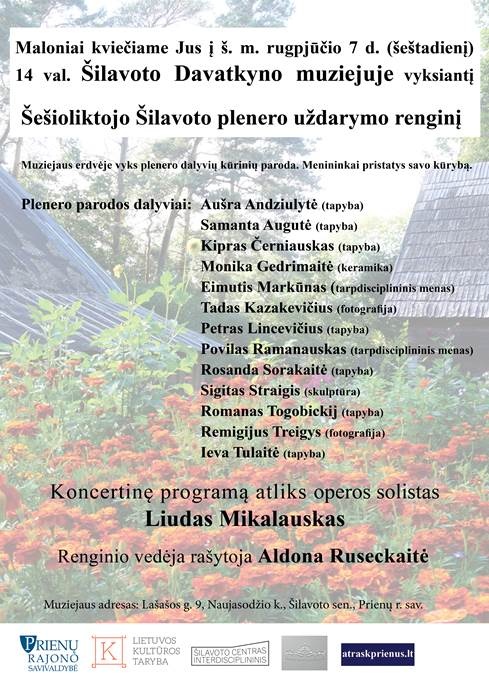 Rugpjūčio 7 dieną (šeštadienį) 14 val. įvyks Šilavoto Davatkyno plenero uždarymo šventė, kurios metu plenero dalyviai pristatys savo kūrybą. Koncertinę programą atliks operos solistas Liudas Mikalauskas (bosas). Renginio vedėja: poetė, rašytoja Aldona Ruseckaitė.